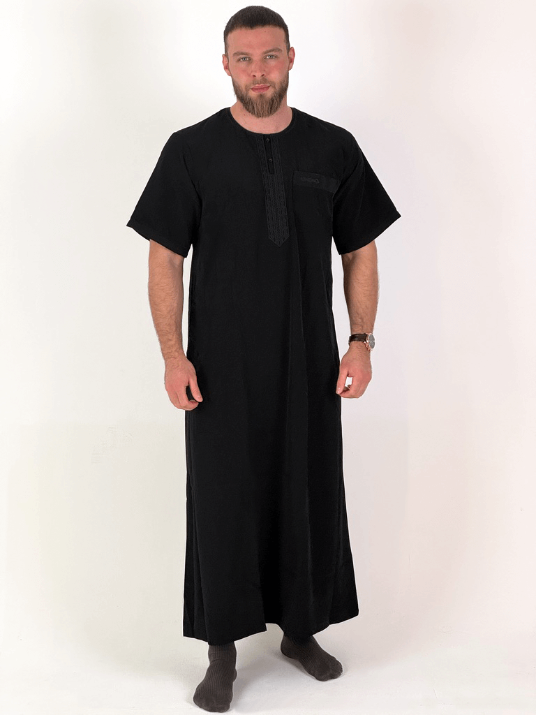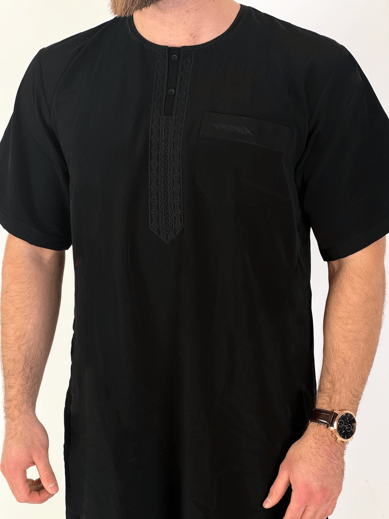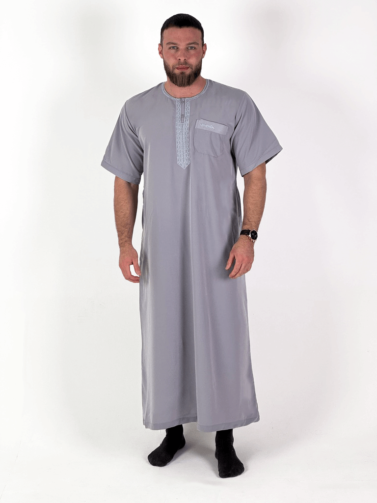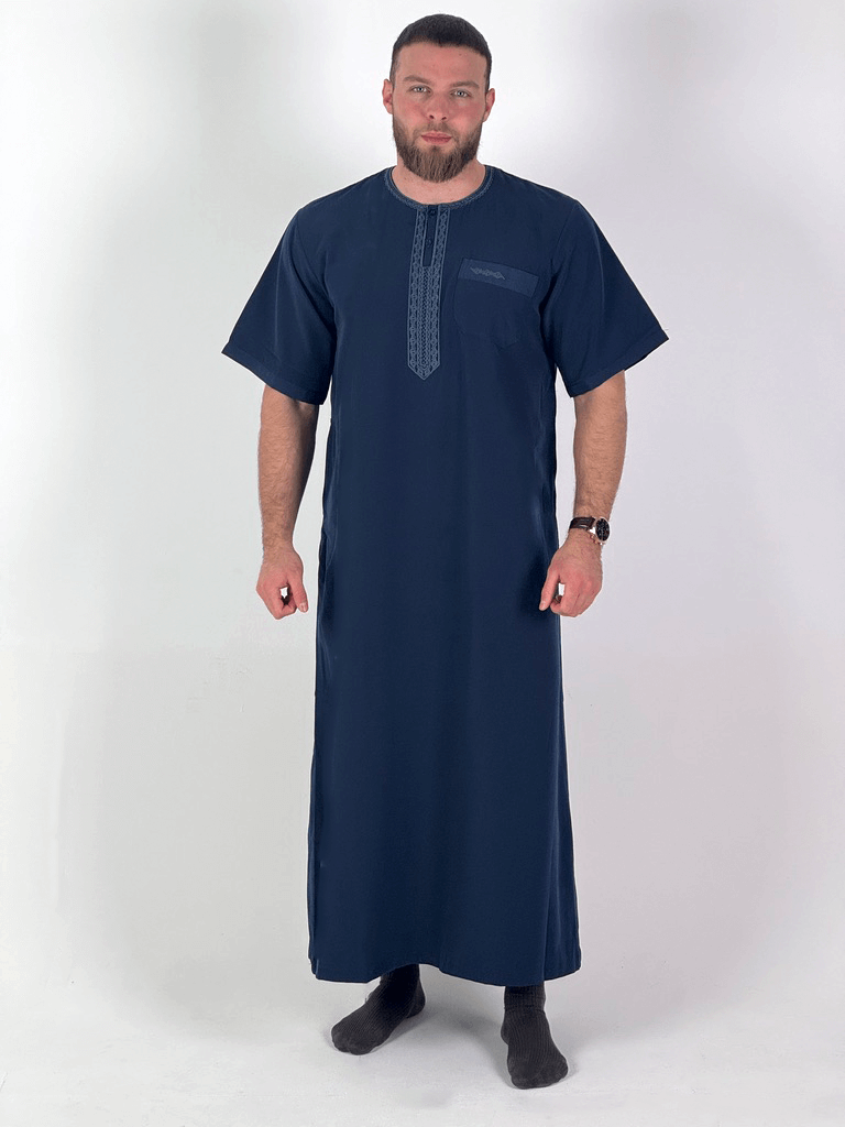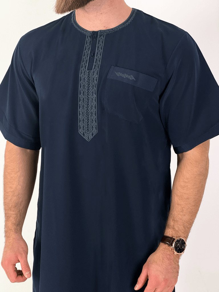A qamis that stands out without being loud. The Moroccan qamis combines a traditional cut with modern details: short sleeves , visible buttons on the collar , and fine, high-quality embroidery make this qamis a stylish companion for warm days and special occasions.